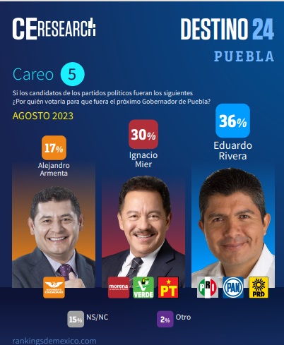 Por el Frente por Puebla, Eduardo Rivera tiene 33 por ciento de aceptación; Blanca Alcalá tiene 16 por ciento de preferencia y Ana Teresa Aranda 9 por ciento.