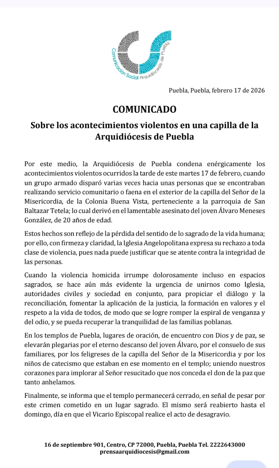 En el documento se informó que en los templos de Puebla se elevarán oraciones por el descanso del joven, por el consuelo de sus familiares y por los feligreses presentes durante el ataque.