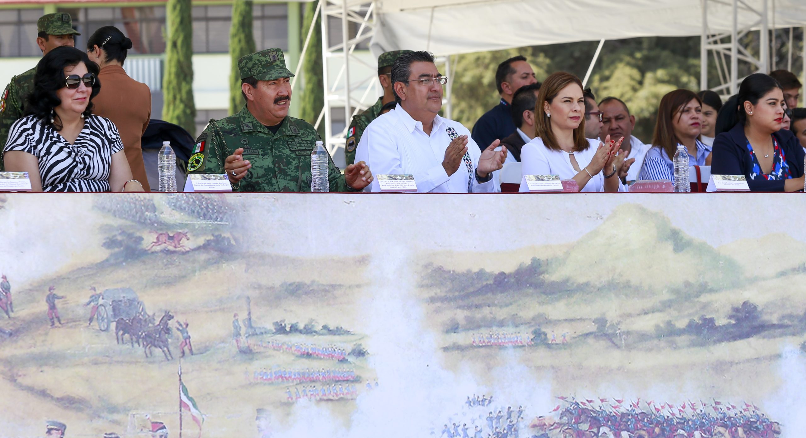 El gobernador Sergio Salomón y su esposa Gaby Bonilla, presidenta honoraria del Patronato del SEDIF, asistieron a la escenificación de la Batalla del 5 de Mayo de 1862, organizada por la XXV Zona Militar.