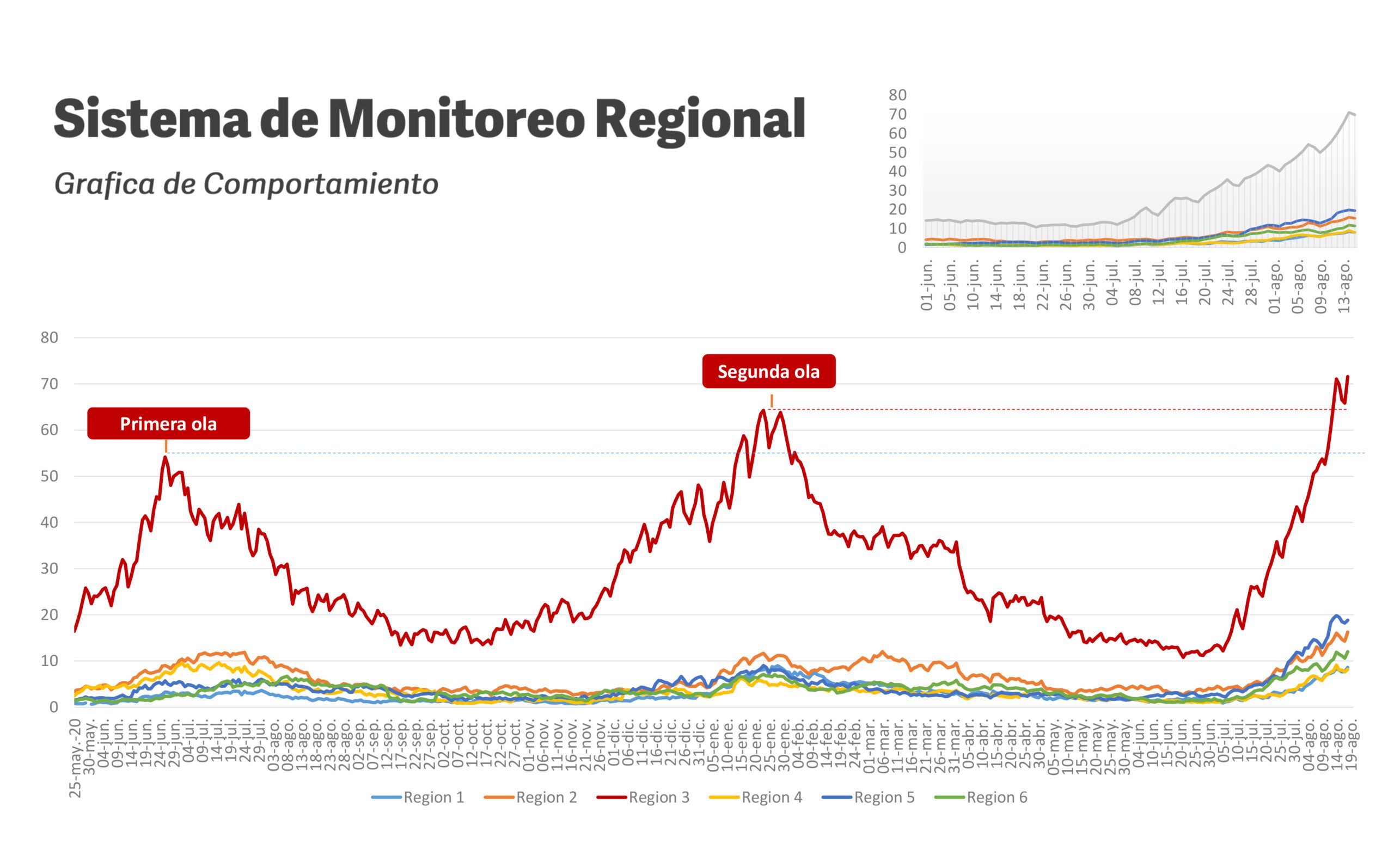 Ante este escenario, Díaz Ramírez expresó que los indicadores del Sistema Regional de Monitoreo establecen que la entidad ya rebasó los picos de la segunda ola registrada en enero pasado, por lo que las seis regiones reportan una tendencia ascendente.