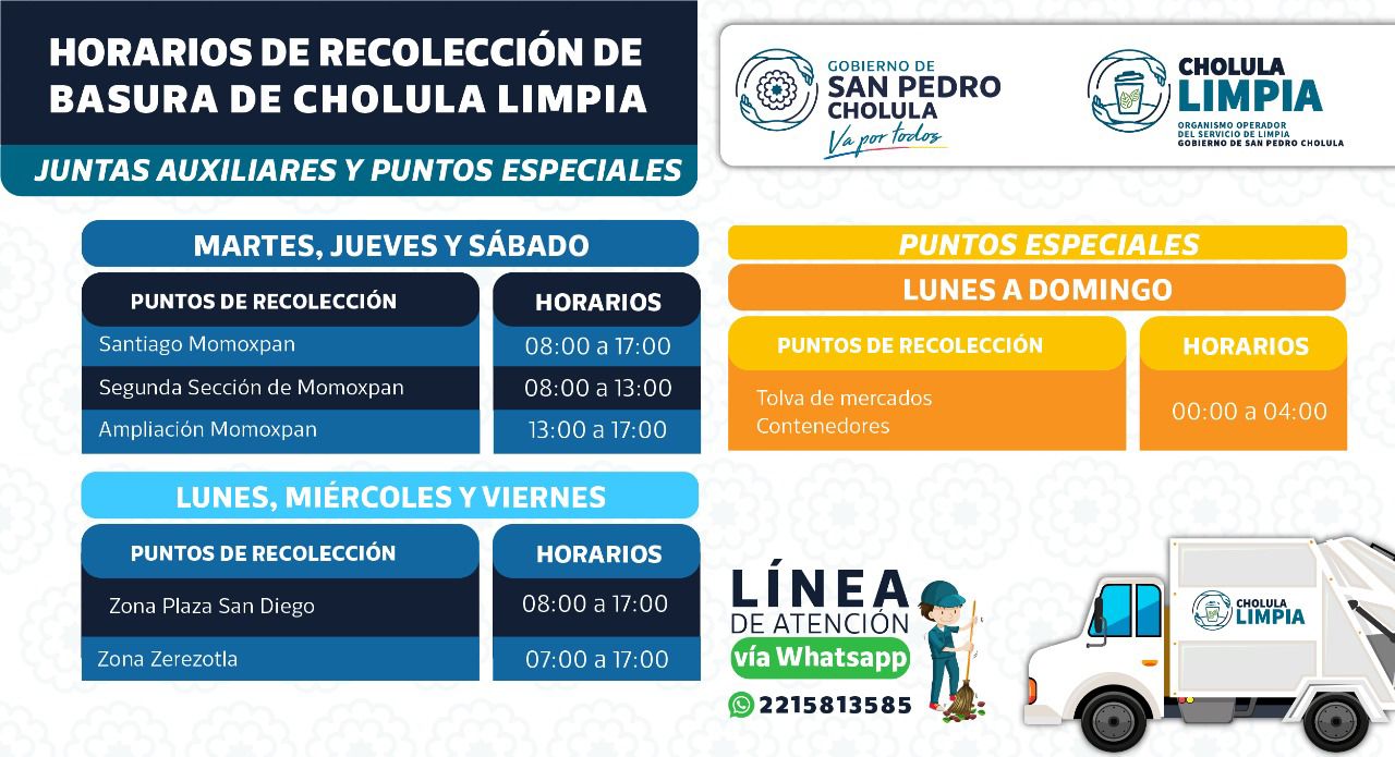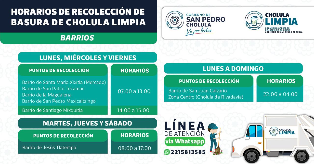 Para ofrecer a la ciudadanía un servicio de recolección de basura eficiente y eficaz, el Ayuntamiento de San Pedro Cholula, a través del Organismo Operador del Servicio de Limpia, desarrolló un nuevo esquema de recolección que permitirá una colecta por zonas definidas y horarios establecidos, que evitará la acumulación de bolsas en esquinas o áreas verdes.