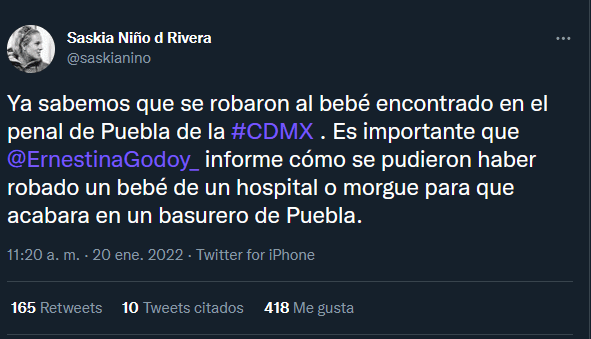 De acuerdo a Saskia Niño de Rivera, activista de la organización Reinserta, dijo en entrevista nacional con el periodista Ciro Gómez Leyva, el menor presuntamente habría sido robado en la Ciudad de México, sin embargo, omitió decir de dónde obtuvo estos datos.