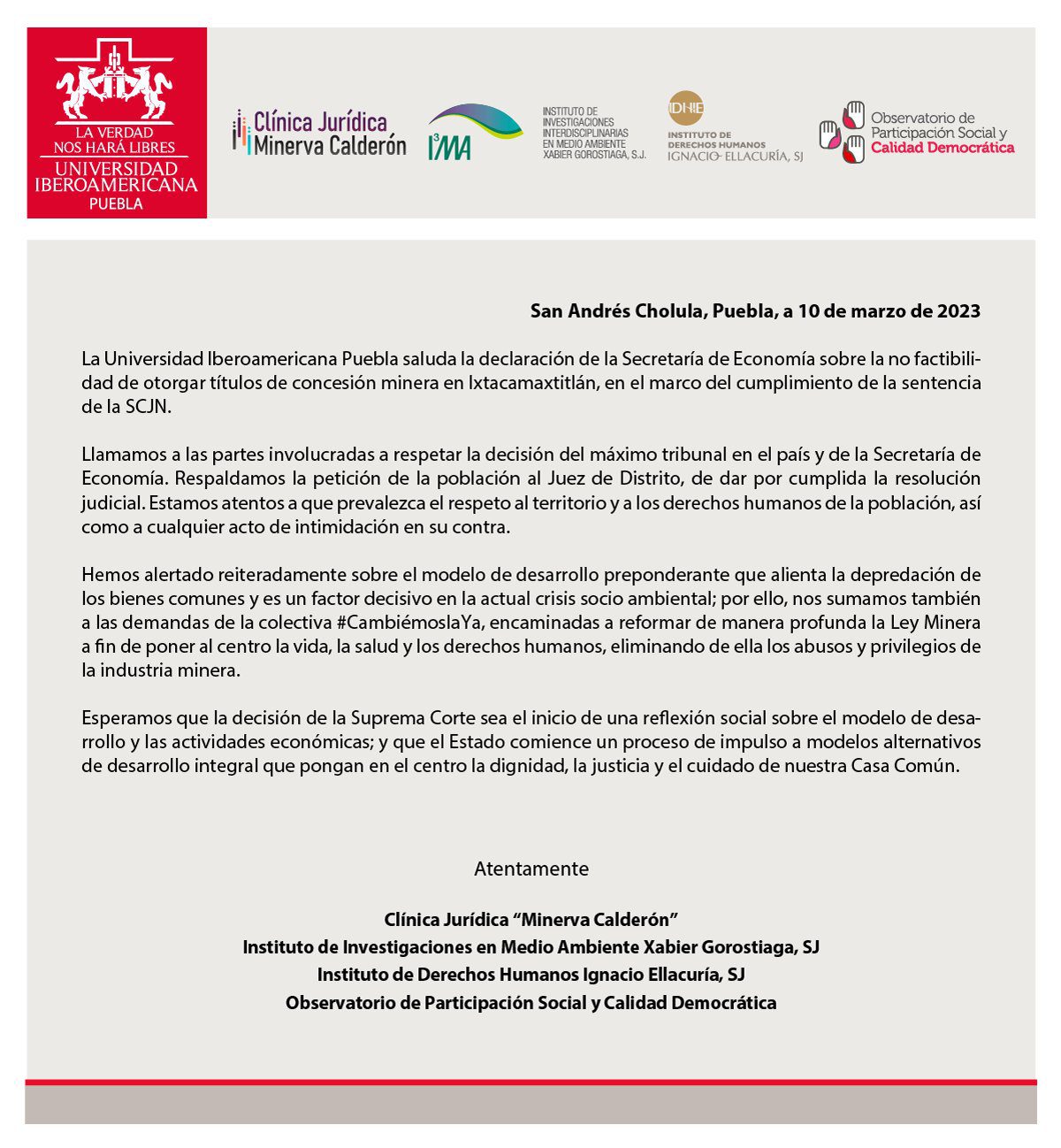 La Ibero Puebla, celebró la declaratoria de la Secretaría de Economía de no factibilidad para otorgar títulos de concesión al proyecto de la mina cielo abierto en el municipio de Ixtacamaxitlán, por parte de Minera Gorrión.