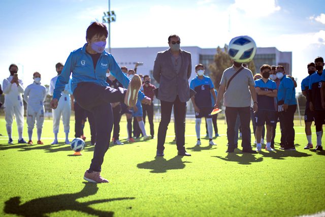 Con la tradicional patada de apertura, la Rectora Lilia Cedillo inaugura la cancha 5 de fútbol soccer
