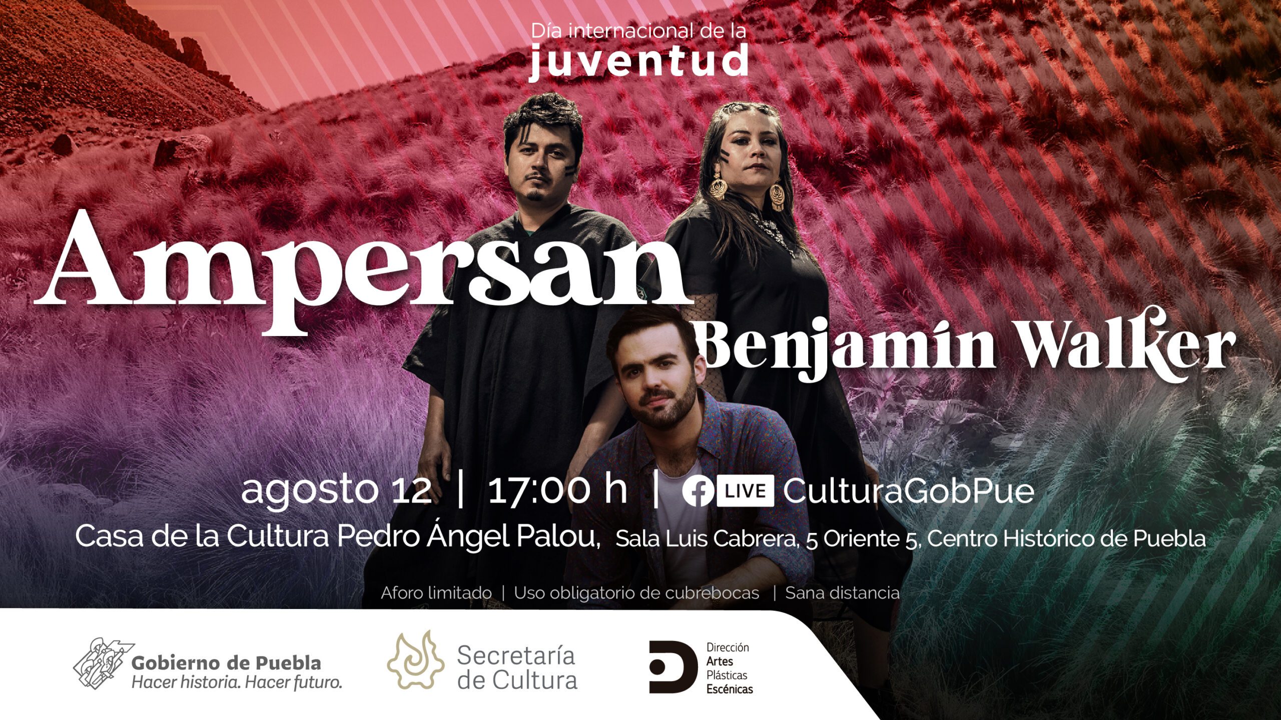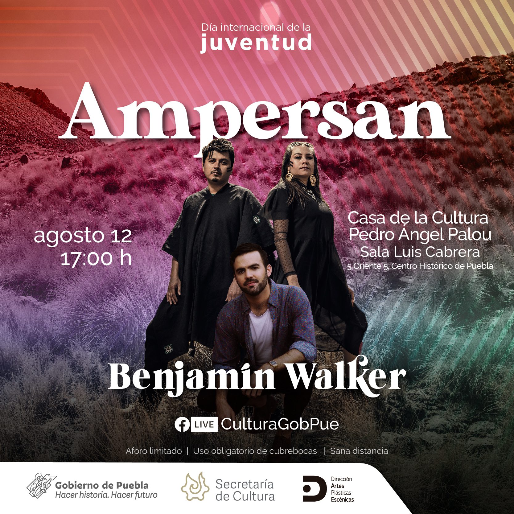 Para abrir dicho concierto, tocará el músico chileno, cantautor y guitarrista Benjamín Walker. Ambos eventos serán transmitidos también por Facebook de la dependencia (Secretaría de Cultura de Puebla), red social en la que también será difundido el cortometraje dancístico “Disociado S” a las 21:00 horas.