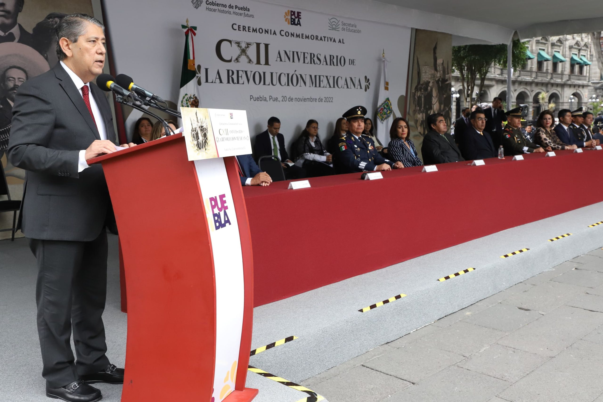 Quienes encabezan actualmente el poder público en Puebla y el país consolidan el legado de la Revolución Mexicana de impulsar la igualdad como elemento central para lograr el desarrollo equitativo de toda la población, manifestó el titular de la Fiscalía General del Estado, Gilberto Higuera Bernal en su discurso como orador en la Ceremonia Conmemorativa al CXII Aniversario de dicho hecho histórico, que fue presidida por el gobernador Miguel Barbosa Huerta.