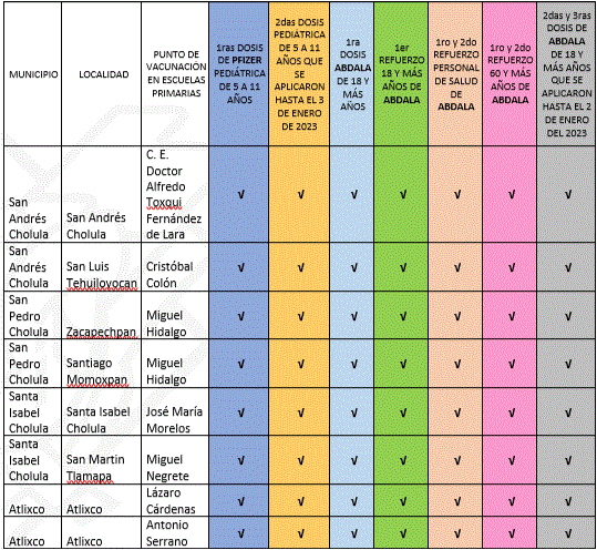 La Secretaría de Salud, en coordinación con la Secretaría de Educación, organiza la jornada de vacunación pediátrica para niños de 5 a 11 años 11 meses, del miércoles 24 al viernes 27 de enero en los municipios de Atlixco, San Andrés, San Pedro y Santa Isabel Cholula.