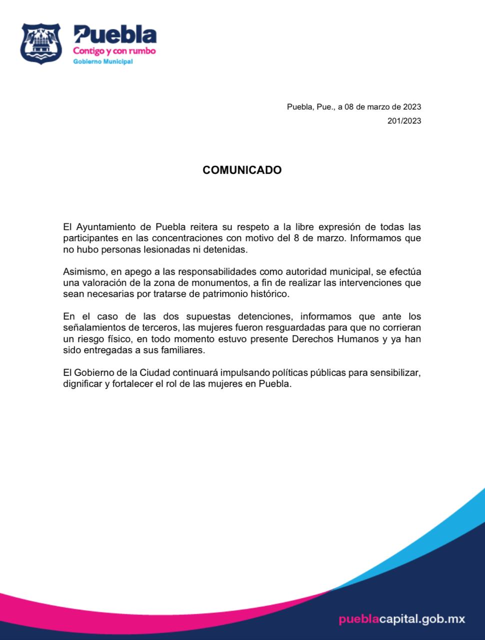 Por su parte, el Ayuntamiento de Puebla emitió un comunicado descartando que se haya tratado de una detención, pero sí hicieron el “resguardo” de las mujeres, esto pese a que en el video se escuchan los gritos de las manifestantes.