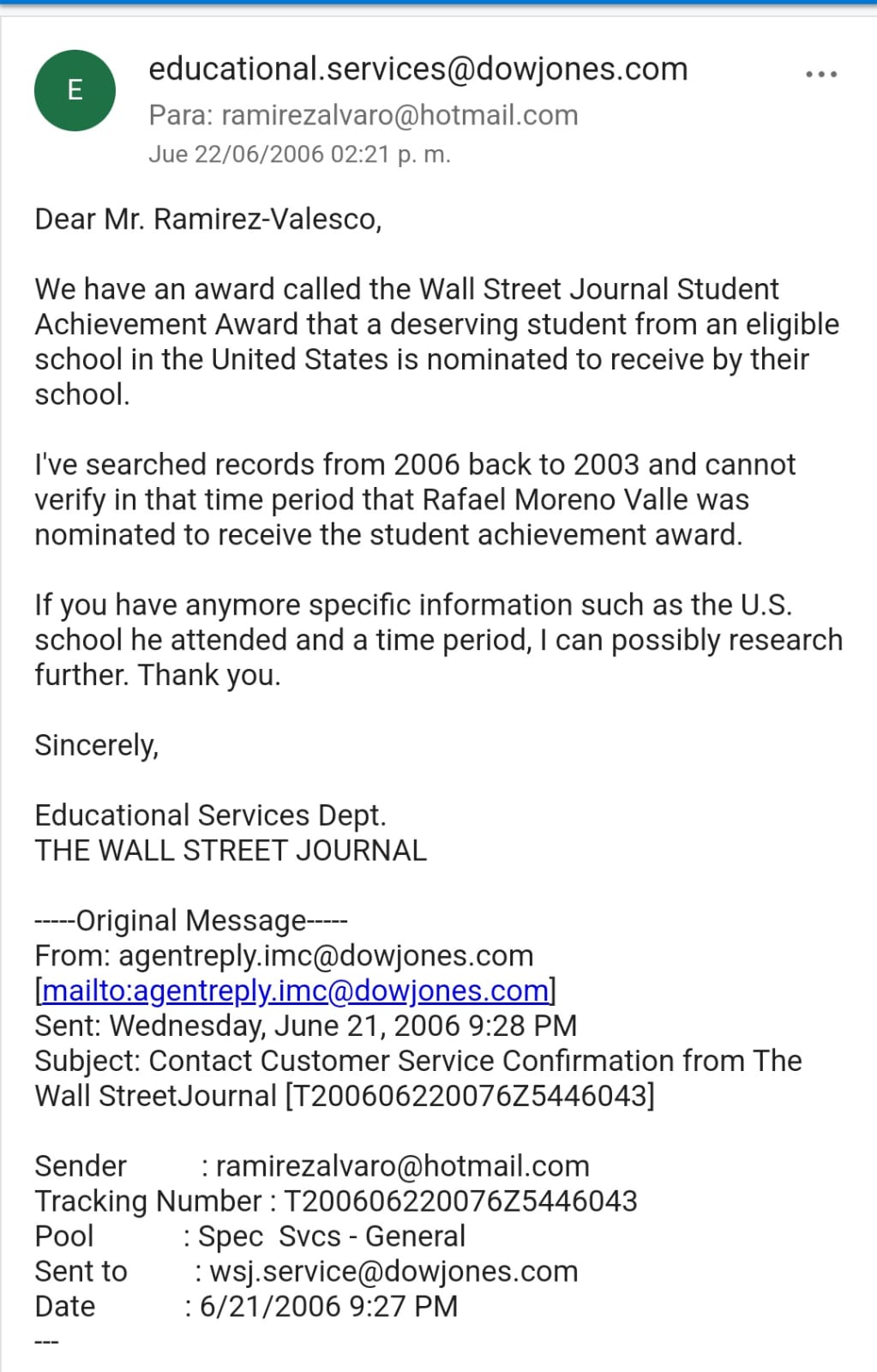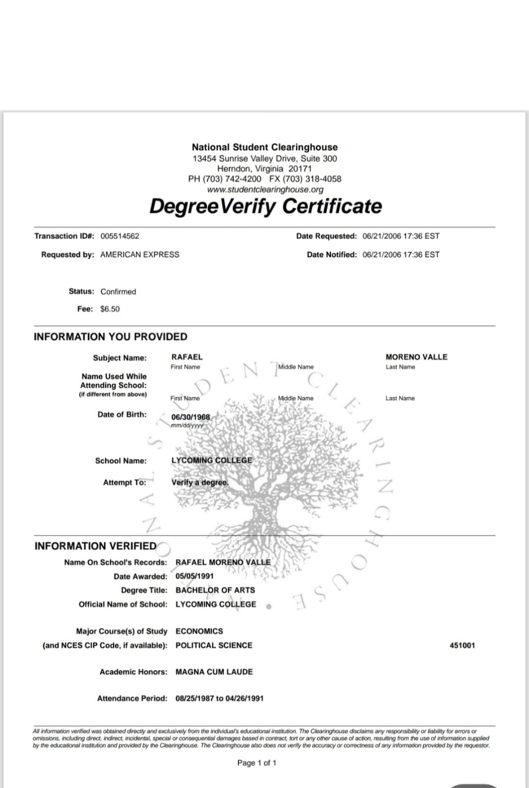 De esa investigación tengo todavía las conversaciones originales, vía correo electrónico y el documento de la National Student Clearing House, en donde se demuestra que su único grado académico real es el de licenciatura (bachelor) en Economía. Mucho más allá de lo que quieran ver sus seguidores, la realidad es que Moreno Valle nunca obtuvo un grado de doctorado.