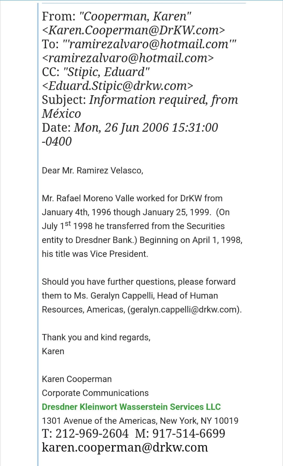 Sin embargo, en este punto, comenzó a inflar su currículum vitae, pues a México vino a decir que fue vicepresidente para América Latina, cuando en realidad fue vicepresidente, pero de un área menor, como aclaró Karen Cooperman, de Comunicaciones Corporativas del Dresdner Kleinwort Wasserstein Services LLC, en Nueva York. Rafael Moreno Valle Rosas “trabajó en Efectos Financieros de DrKW, del 4 de enero de 1996 al 25 de enero de 1999. El 1 de julio de 1998 fue transferido al Dresdner Bank, comenzando el 1 de abril de 1998. Su título fue de vicepresidente”.