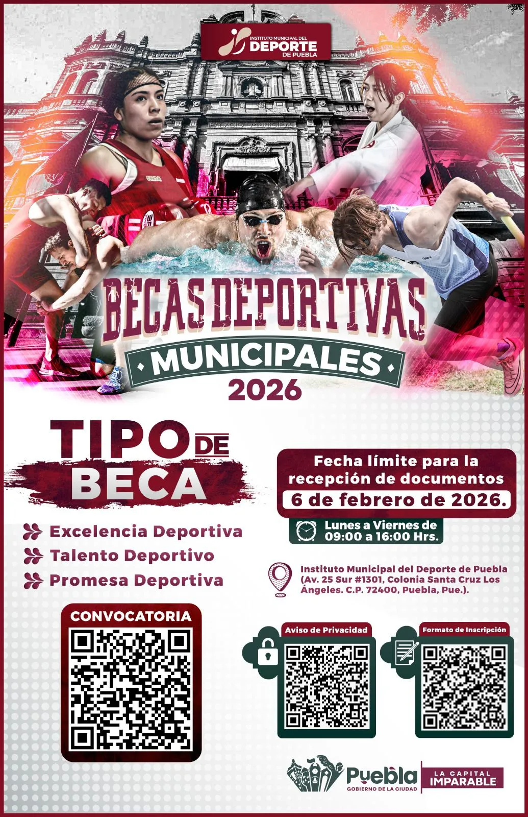 Con el propósito de reforzar el esfuerzo deportivo y disciplina, el Gobierno de la Ciudad, encabezado por el alcalde Pepe Chedraui Budib, a través del Instituto Municipal del Deporte de Puebla (IMDP), dirigido por Ricardo Zayas Gallardo, anunció la convocatoria para las Becas Deportivas Municipales 2026, un programa que busca impulsar el talento poblano y fortalecer el deporte en la capital.