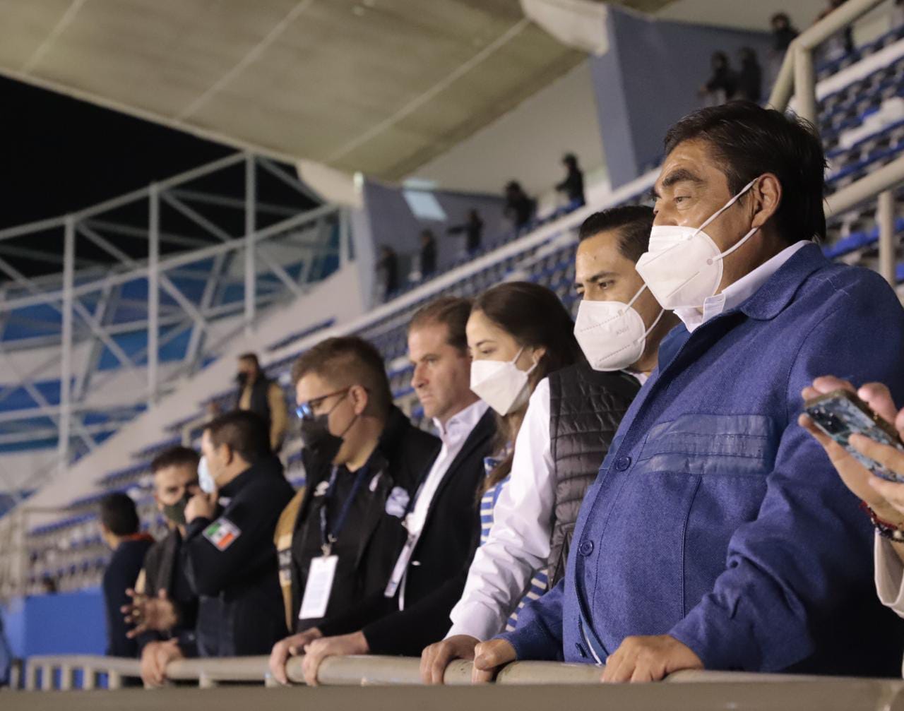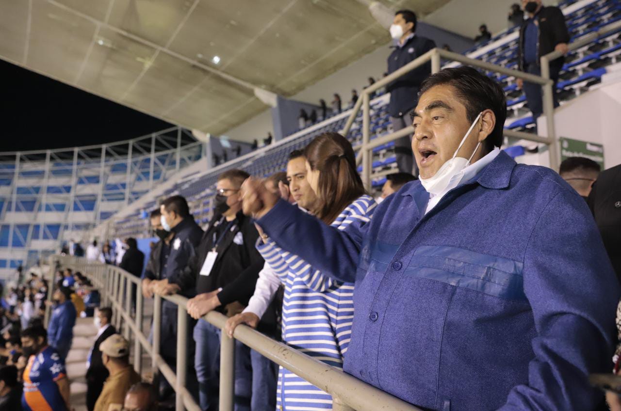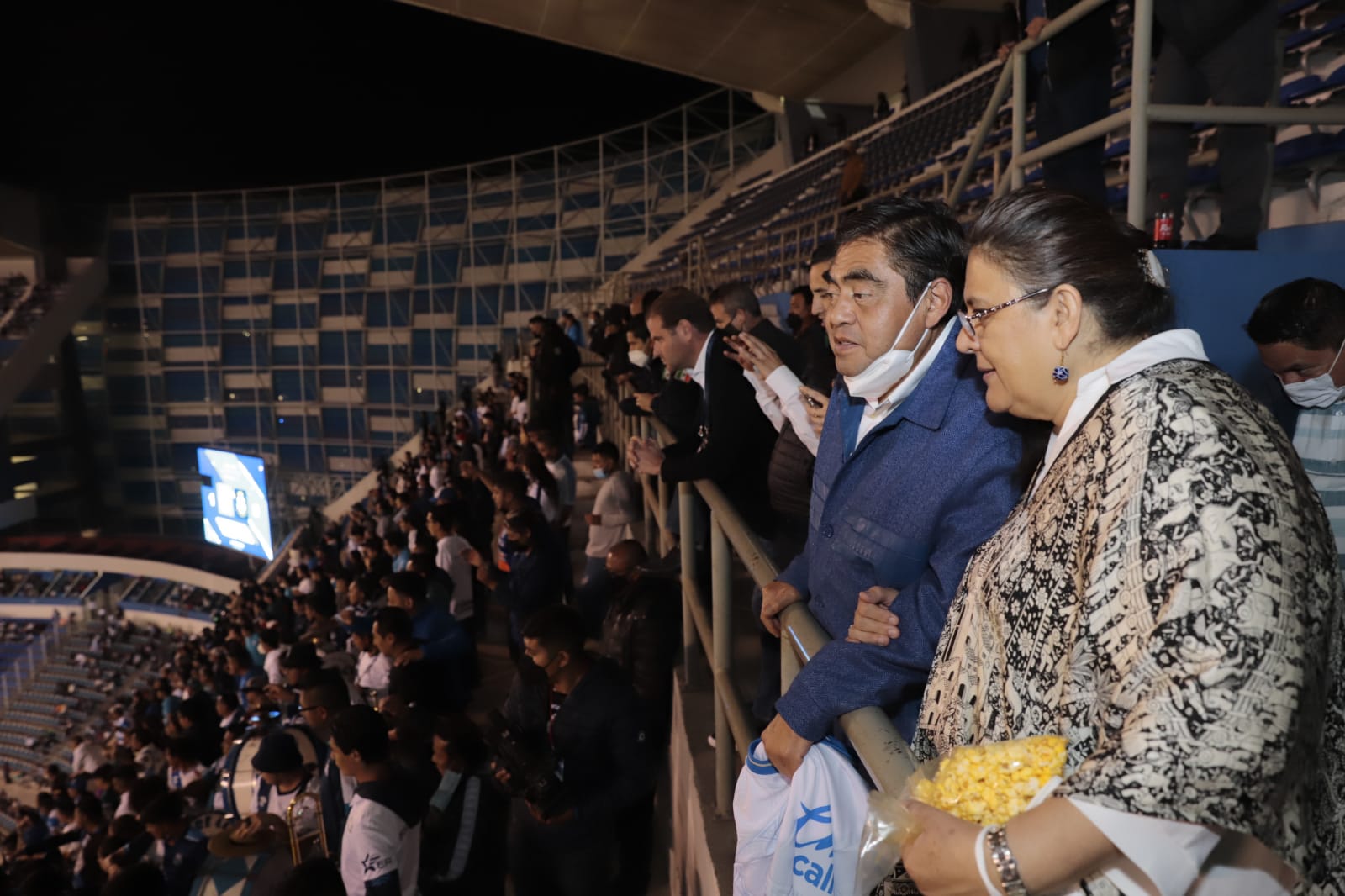 El gobernador Miguel Barbosa Huerta y la presidenta honoraria del Patronato del Sistema Estatal DIF, Rosario Orozco Caballero, convivieron con los grupos de animación del Club Puebla durante el encuentro contra Santos Laguna en el Estadio Cuauhtémoc.