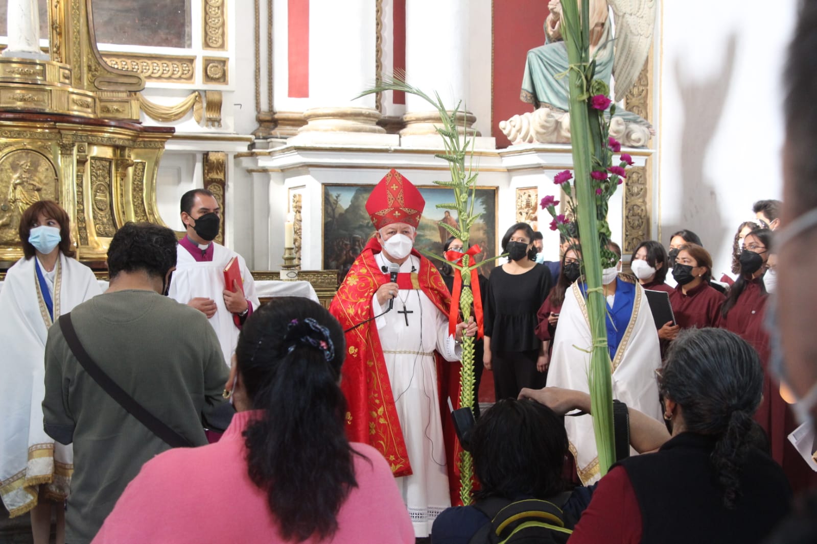 El arzobispo de Puebla, Víctor Sánchez Espinosa encabeza la Procesión de Domingo de Ramos que parte de la Capilla del Sagrario rumbo a Catedral.