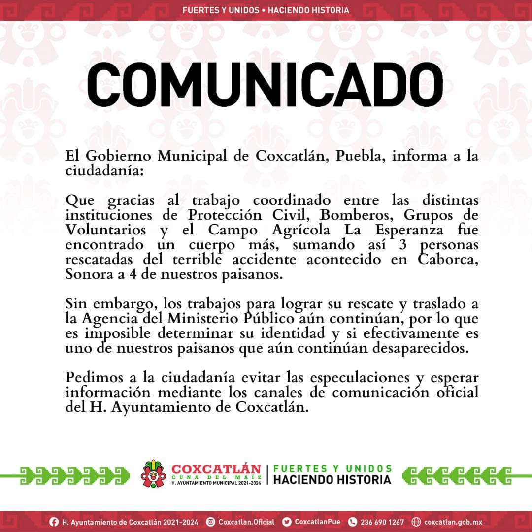 En un comunicado, el Ayuntamiento de Coxatlán informó que tras labores, se encontró otro cuerpo pero “los trabajos para lograr su rescate y traslado a la Agencia del Ministerio Público aún continúan, por lo que es imposible determinar su identidad y si efectivamente es uno de nuestros paisanos”.