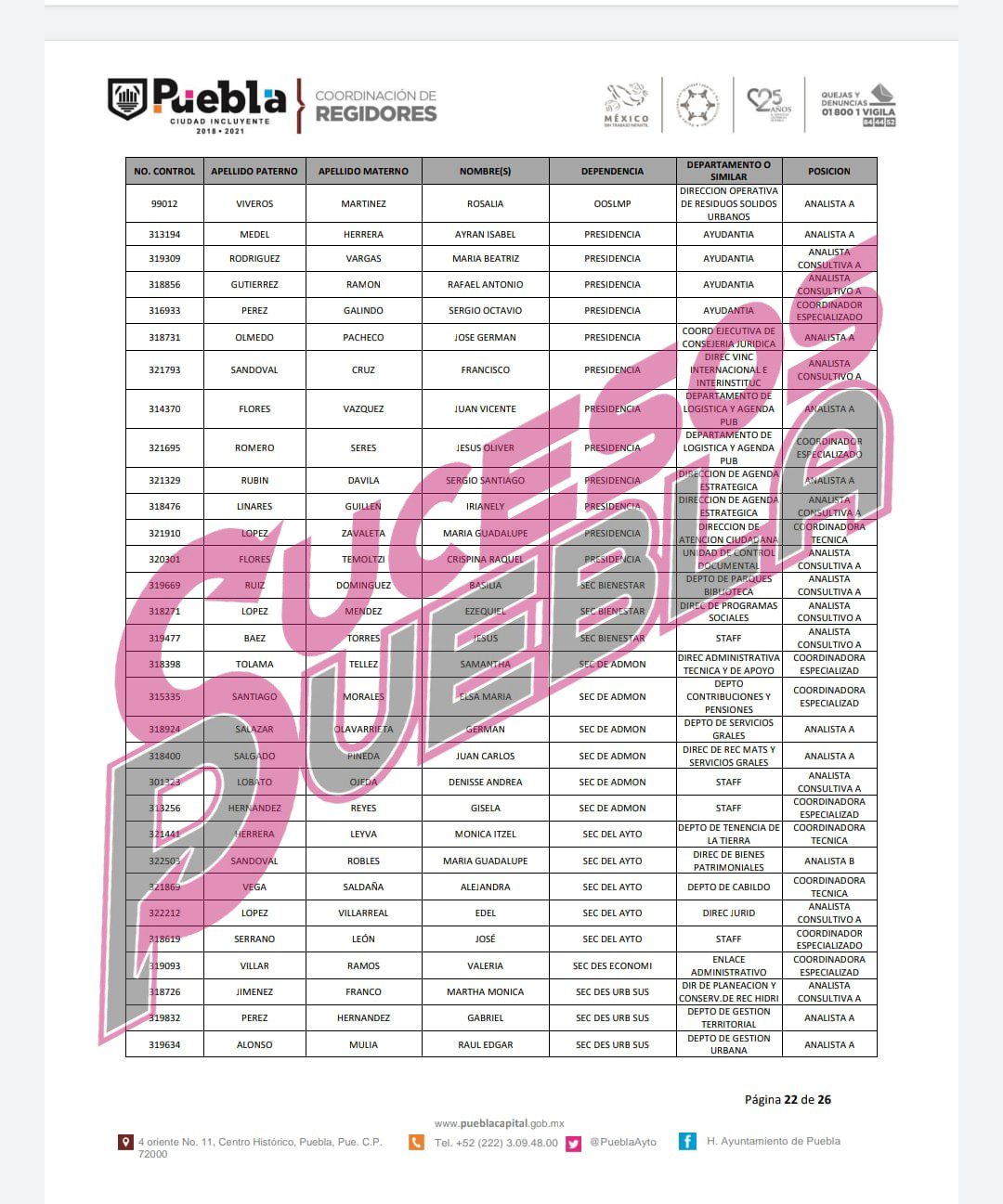 Aunque ninguna de las cien bases de trabajo que la alcaldesa Claudia Rivera Vivanco corresponden a familiares directos de la alcaldesa, sí figuran nombres de morenistas y personal allegado a ella y a los regidores del Cabildo.