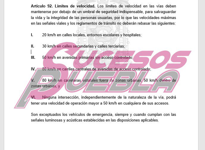 En el artículo 92 de la iniciativa, se especifica que los límites de velocidad en las vías deben mantenerse por debajo de un umbral de seguridad indispensable, para salvaguardar la vida y la integridad de las personas usuarias, por lo que las velocidades máximas en las señales viales y los reglamentos de tránsito no deberán rebasar las siguientes: