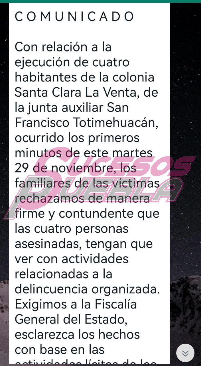 «Con relación a la ejecución de cuatro habitantes de la colonia Santa Clara La Venta, de la junta auxiliar San Francisco Totimehuacán, ocurrido los primeros minutos de este martes 29 de noviembre, los familiares de las víctimas rechazamos de manera firme y contundente que las cuatro personas asesinadas, tengan que ver con actividades relacionadas a la delincuencia organizada.