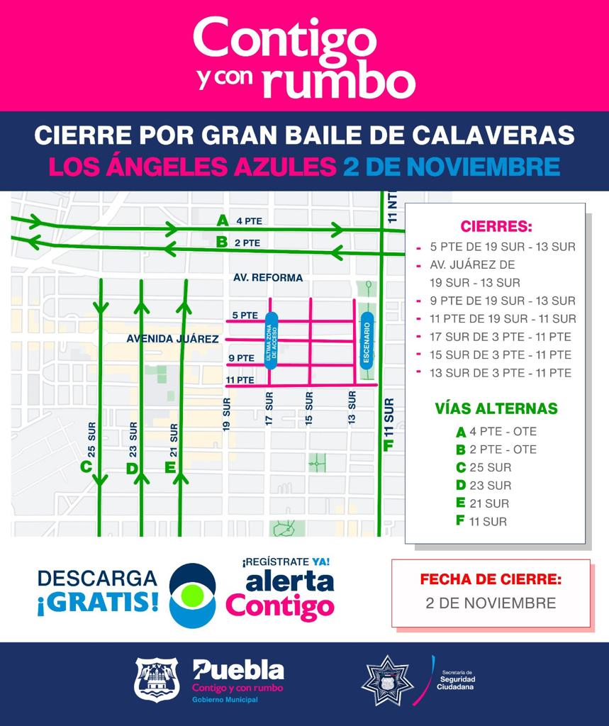 Con motivo del ‘Gran Baile de Calaveras’ que se llevará a cabo este próximo 2 de noviembre con la participación estelar de Los Ángeles Azules, el Ayuntamiento de Puebla anuncia los siguientes cierres temporales en diversas calles de la zona del Paseo Bravo y Avenida Juárez.