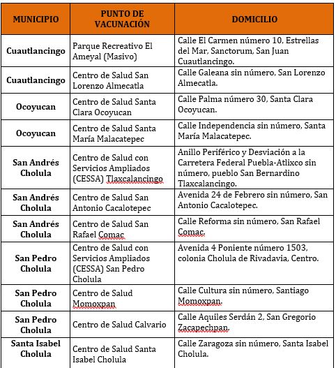 – Las instituciones que integran la Brigada Correcaminos (SEDENA, Bienestar, ISSSTE, IMSS, ISSSTEP y Servicios de Salud) llevarán a cabo, del miércoles 06 al viernes 08 de julio, la jornada de vacunación contra la COVID-19 para menores de 5 a 11 años 11 meses cumplidos en cinco municipios de la zona conurbada (Santa Isabel Cholula, San Pedro y San Andrés Cholula, Santa Clara Ocoyucan y Cuautlancingo).
