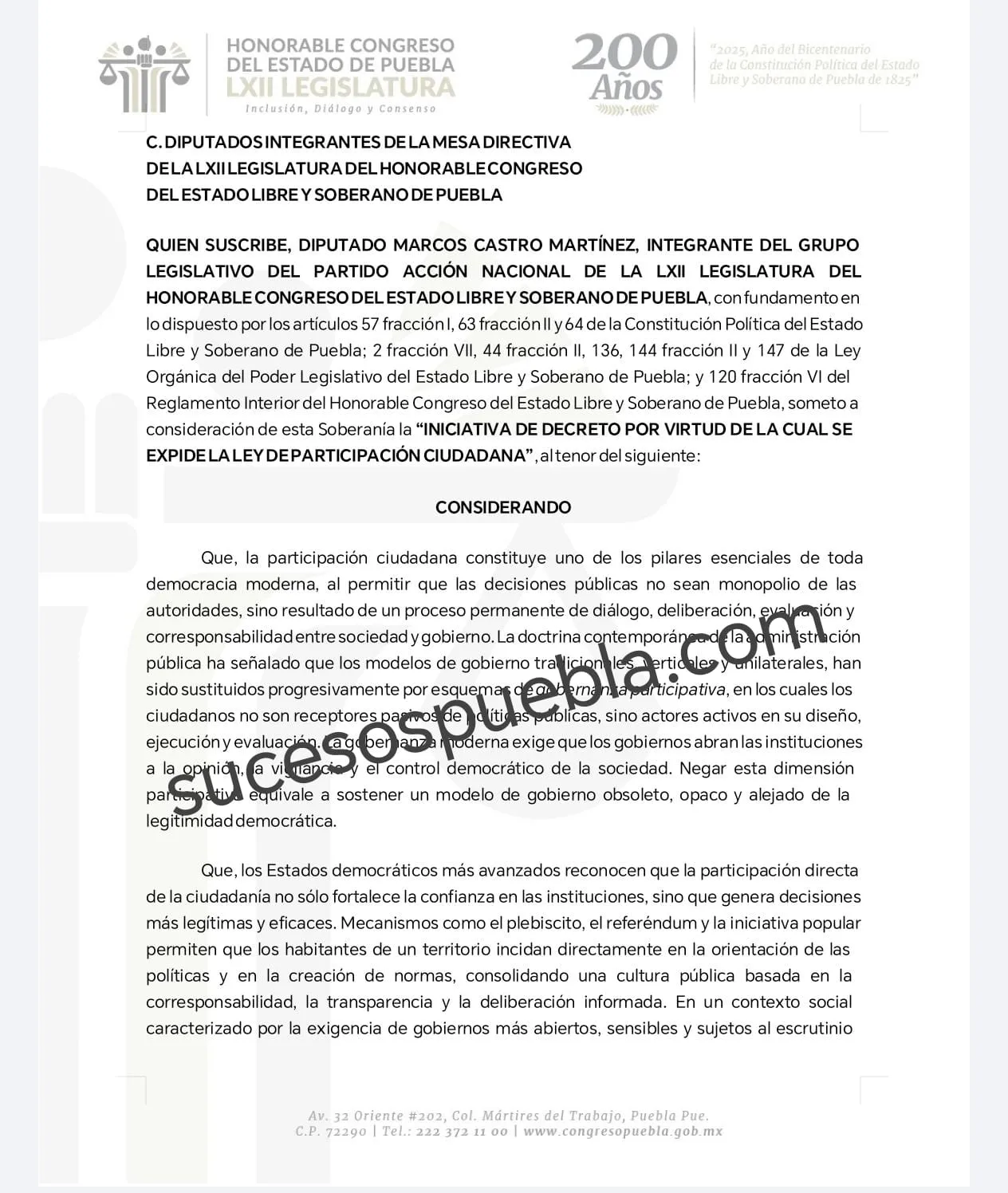 El diputado del PAN, Marcos Castro Martínez, presentó en el Congreso del Estado una iniciativa para expedir la Ley de Participación Ciudadana, al señalar que Puebla es la única entidad del país que no cuenta con este ordenamiento. La propuesta busca regular mecanismos de democracia directa y establecer procedimientos formales para la intervención ciudadana en decisiones públicas.