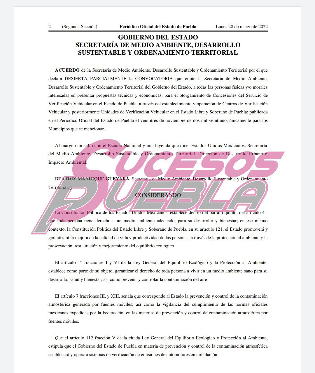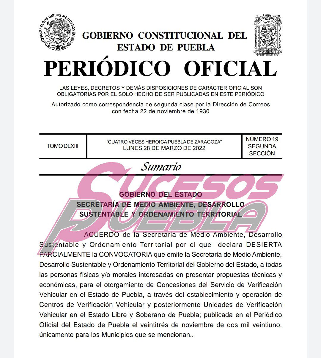 “En virtud de que no se recibieron propuestas para algunos Municipios, y en otros casos las propuestas que fueron presentadas no cumplen con los requisitos establecidos en la Convocatoria citada y las Bases de participación; esta Secretaría de Medio Ambiente, Desarrollo Sustentable y Ordenamiento Territorial, declara DESIERTA parcialmente la CONVOCATORIA que emite la Secretaria de Medio Ambiente, Desarrollo Sustentable y Ordenamiento Territorial del Gobierno del Estado, a todas las personas físicas y/o morales interesadas en presentar propuestas técnicas y económicas, para el otorgamiento de concesiones del servicio de verificación vehicular en el Estado de Puebla”, se cita en el documento.