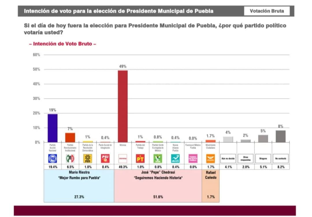 El 49.3 por ciento de las y los encuestados respondieron que votarían por Morena y el 19.4 por ciento por el PAN, esto al ser cuestionados sobre “Si el día de hoy fuera la elección para presidente municipal de Puebla, ¿Por qué partido votaría usted?”.