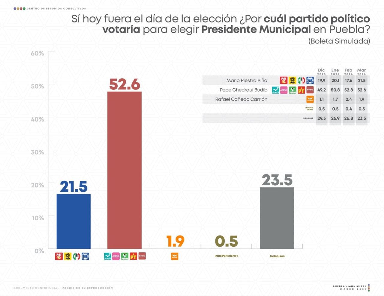 De acuerdo con la encuesta difundida por el Centro de Estudios Consultivos, en el ejercicio de presentar una boleta simulada, el 51.6 por ciento de las y los participantes señalaron que votarían por Pepe Chedraui, candidato de Morena y sus aliados; mientras que solo el 21.5 por ciento lo haría por el contrincante más cercano, lo que representa una diferencia de 31.1 puntos porcentuales.