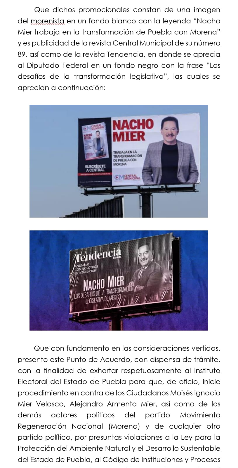 “Solicitamos exhortar al Instituto Electoral para que inicie el procedimiento en contra de los antes mencionados por presuntas violaciones a la Ley para la Protección al Medio Ambiente, Desarrollo Sustentable del estado de Puebla; al Código de Instituciones y Procesos Electorales del Estado de Puebla y demás normatividad aplicable, en virtud de la colocación, difusión y/o tolerancia de su aparición de espectaculares con la supuesta propaganda de portadas y/o anuncios en las que se intenta promocionar al personaje con fotografía y con nombre de los aspirantes a candidatos en mención y a su vez para que se dicten las medidas cautelares correspondientes”, comentó.