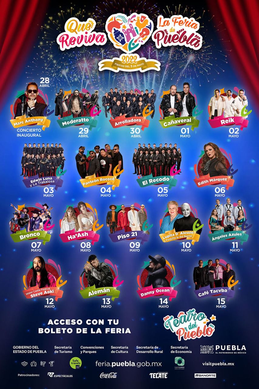 El gobernador Miguel Barbosa Huerta encabezó la presentación de la Feria de Puebla 2022, como parte del programa general “Que Reviva Puebla”, que busca reactivar la económica después de dos años de la pandemia de la Covid-19, el costo de la entrada será de 50 pesos, personas de la tercera edad, con discapacidad y menores de edad con menos de un metro de altura entrarán gratis, los eventos se realizarán del 28 de abril al 15 de mayo.