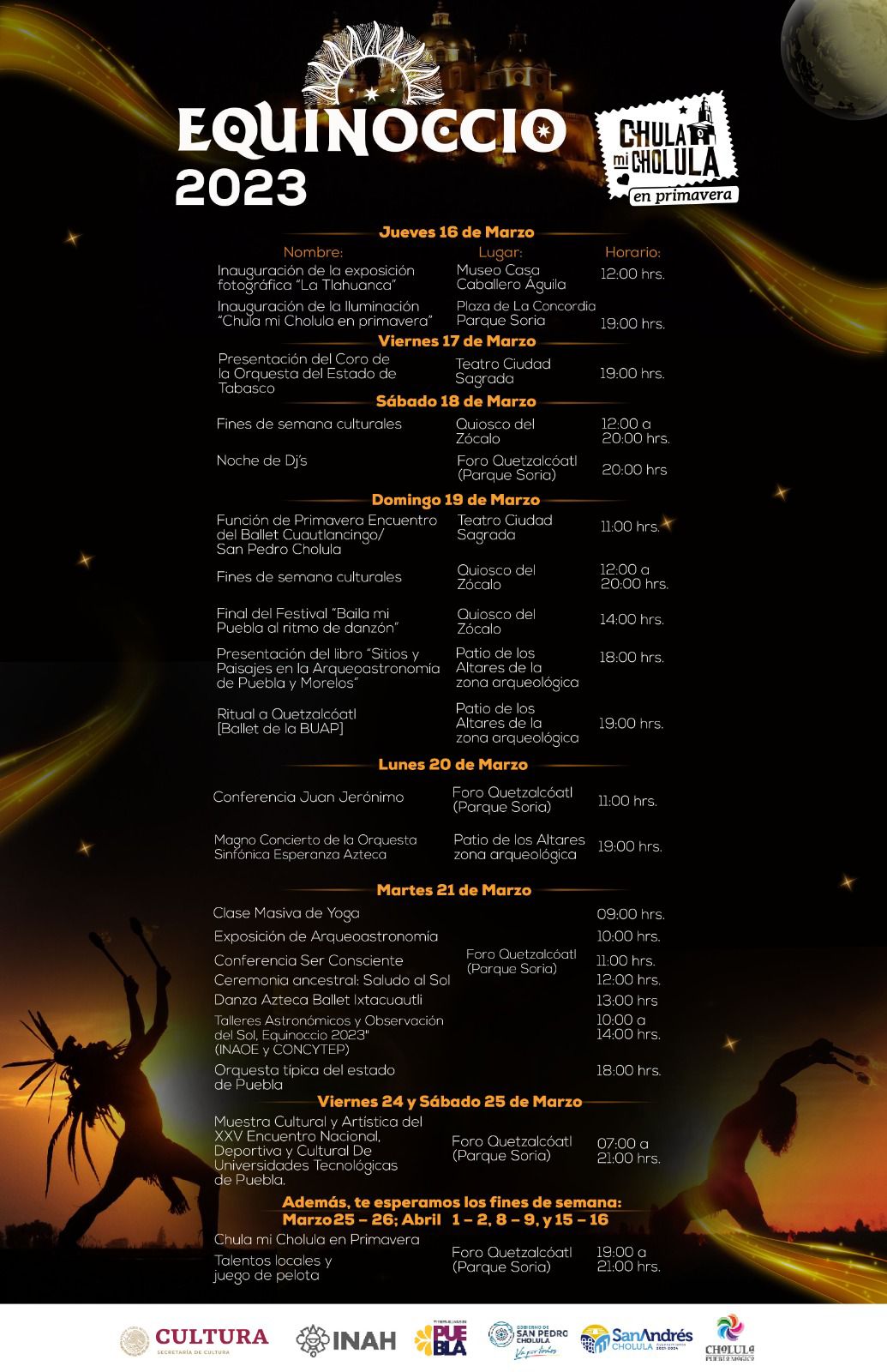 En este sentido, como cada año, el municipio cholulteca celebra la llegada de la primavera con rituales y eventos que reflejan la cultura ancestral de esta ciudad milenaria por lo que en estrecha colaboración con el INAH y en conjunto con el municipio vecino de San Andrés Cholula, sumaron esfuerzos luego de 15 años sin ocurrir, para ofrecer una amplia cartelera entre las que destacan actividades como ceremonias, rituales prehispánicos y el tradicional juego de pelota.
