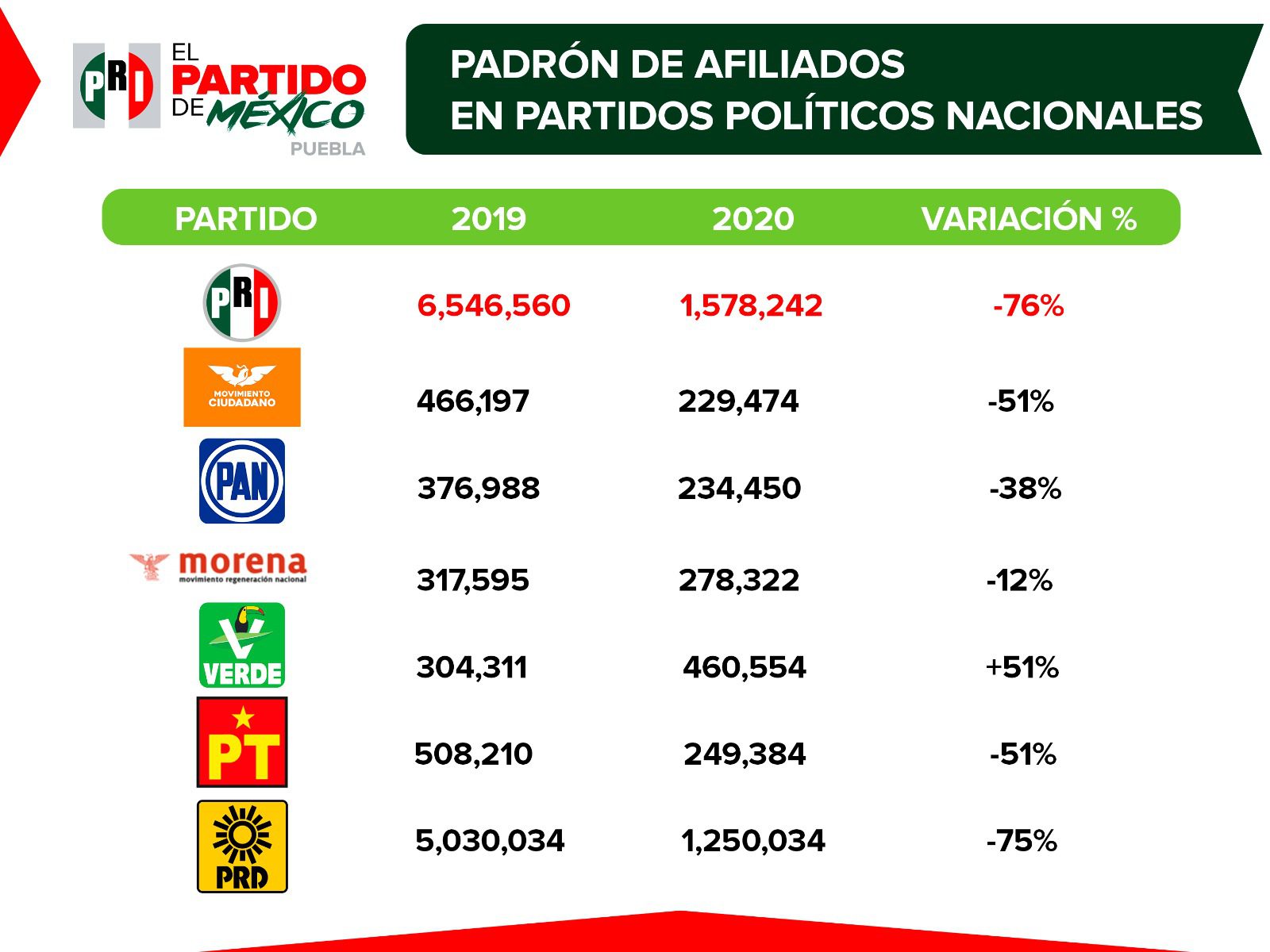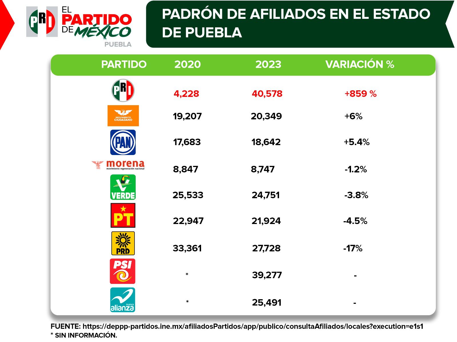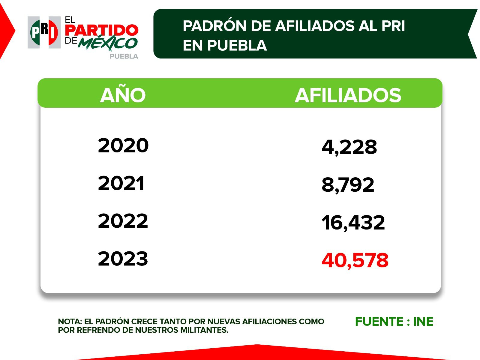 En julio de 2020, cuando asumieron la dirigencia estatal del Partido, el diputado Néstor Camarillo Medina y la diputada Isabel Merlo Talavera, recibieron un padrón con 4 mil 228 militantes registrados; en 2021 la cifra se duplicó, con 8 mil 792; para 2021 fueron 16 mil 432, es decir, un aumento del 86 por ciento, mientras tanto, en este 2023 ya suman 40 mil 578 priistas en Puebla, esto significa un aumento del 859 por ciento en los últimos 3 años.