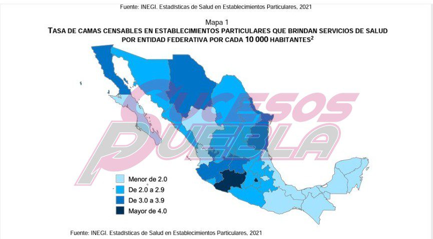 Según las Estadísticas de Salud en Establecimientos Particulares del Inegi, en 2021, Puebla contó con mil 663 camas censables, el 4.5% de las 36 mil 095 disponibles en hospitales o clínicas privadas de todo el país.