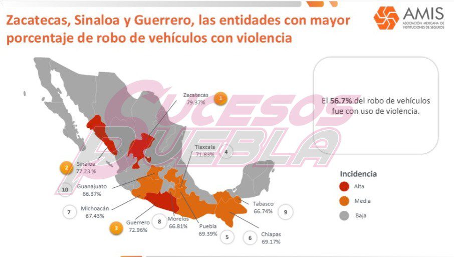Además, Puebla ocupa el quinto lugar nacional con mayor porcentaje de robo de vehículos con violencia con el 69.49 por ciento de casos que presentan esta condición, es decir, dos de cada tres.
