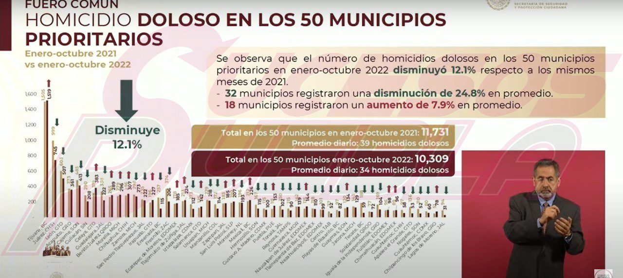 Según el informe presentado por la Secretaría de Seguridad Pública Ciudadana durante la conferencia matutina del Gobierno de la República, 18 de los 50 municipios prioritarios para la federación, por sus altos índices de homicidios, registraron un aumento promedio del 7.9 por ciento en casos, entre octubre de 2021 y octubre de 2022.