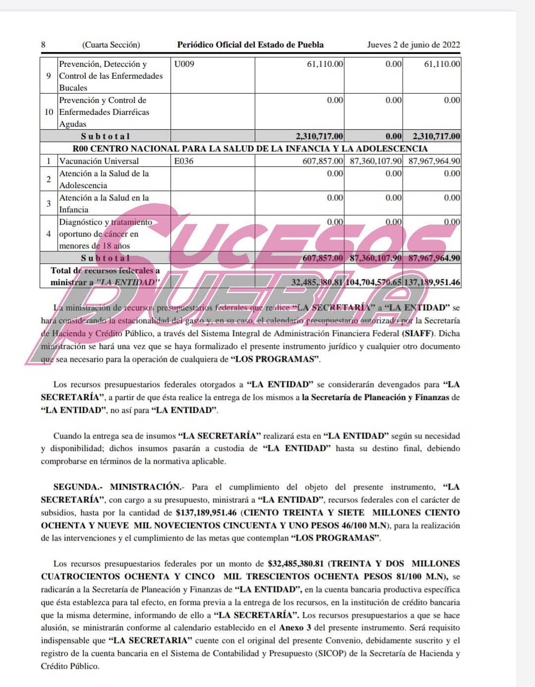 Puebla recibirá 137 millones 189 mil 951.46 pesos por parte del Gobierno Federal que serán destinados para la ejecución de programas en materia de salud, el documento quedó publicado en el Periódico Oficial del Estado y será la Secretaría de Planeación y Finanzas la que reciba recursos mensuales por 32.5 millones de pesos.