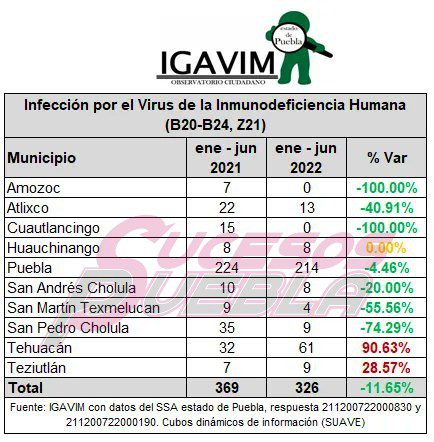 En la entidad poblana, hubo una disminución del 20.65% de infecciones por el Virus de Inmunodeficiencia Humana entre el 1er sem 2021 y el mismo período de 2022 atendidas por el sector salud@Gob_Puebla @SSalud_mx @CongresoPue pic.twitter.com/jcB9O0tnOE— IGAVIM ObsCiudadano (@IGAVIM) November 30, 2022