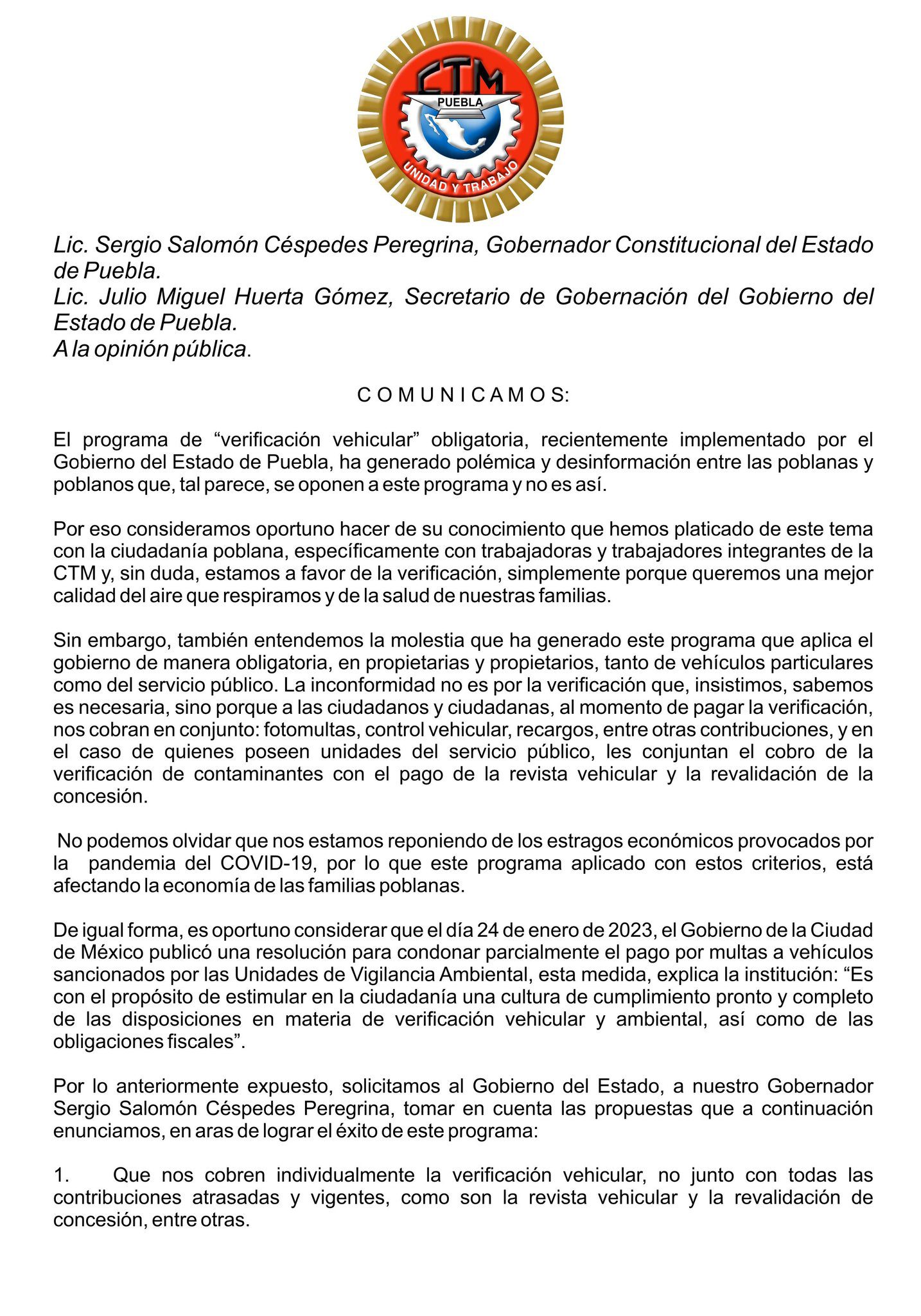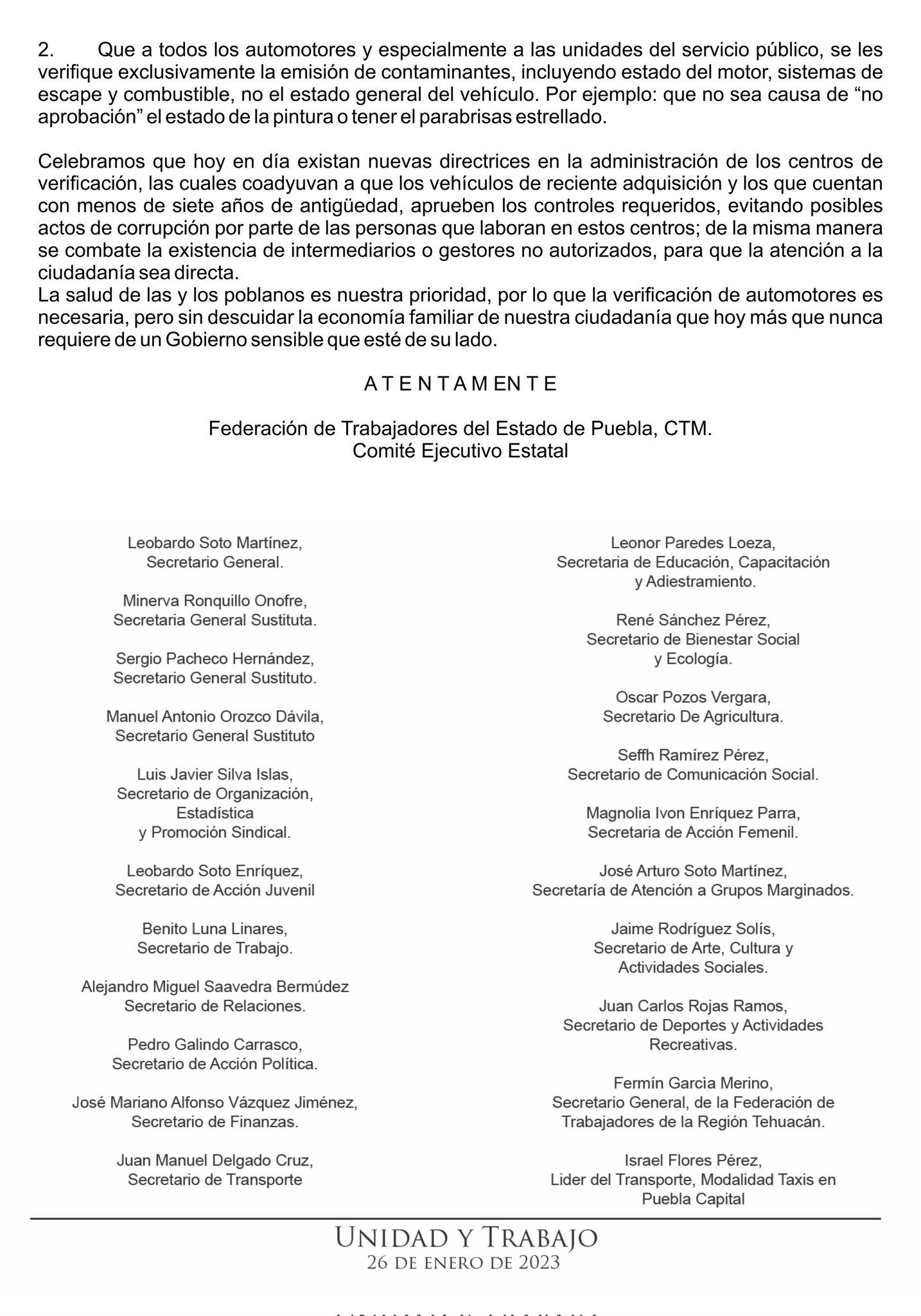 La Confederación de Trabajadores de México (CTM) se pronunció a favor del programa de verificación vehicular en Puebla pues consideraron que la medida mejora la calidad del aire y la salud de las familias.
