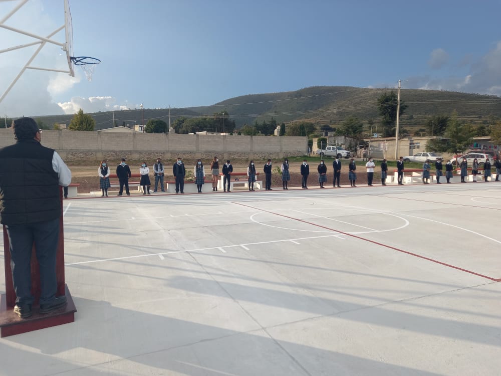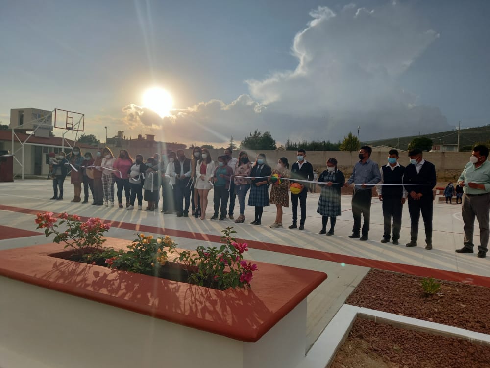 La cancha de usos múltiples, construida de concreto hidráulico, cuenta con una superficie de 510 metros cuadrados que beneficiará directamente a 120 estudiantes.