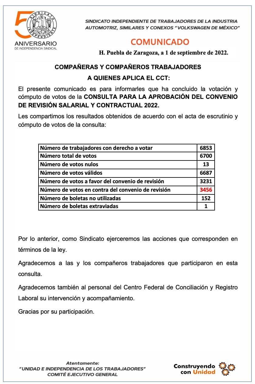 Los sindicalizados de Volkswagen de México volvieron a rechazar la oferta de incremento salarial global del 11 por ciento que propuso la empresa, con lo cual existe riesgo de que la huelga estalle el próximo 9 de septiembre.