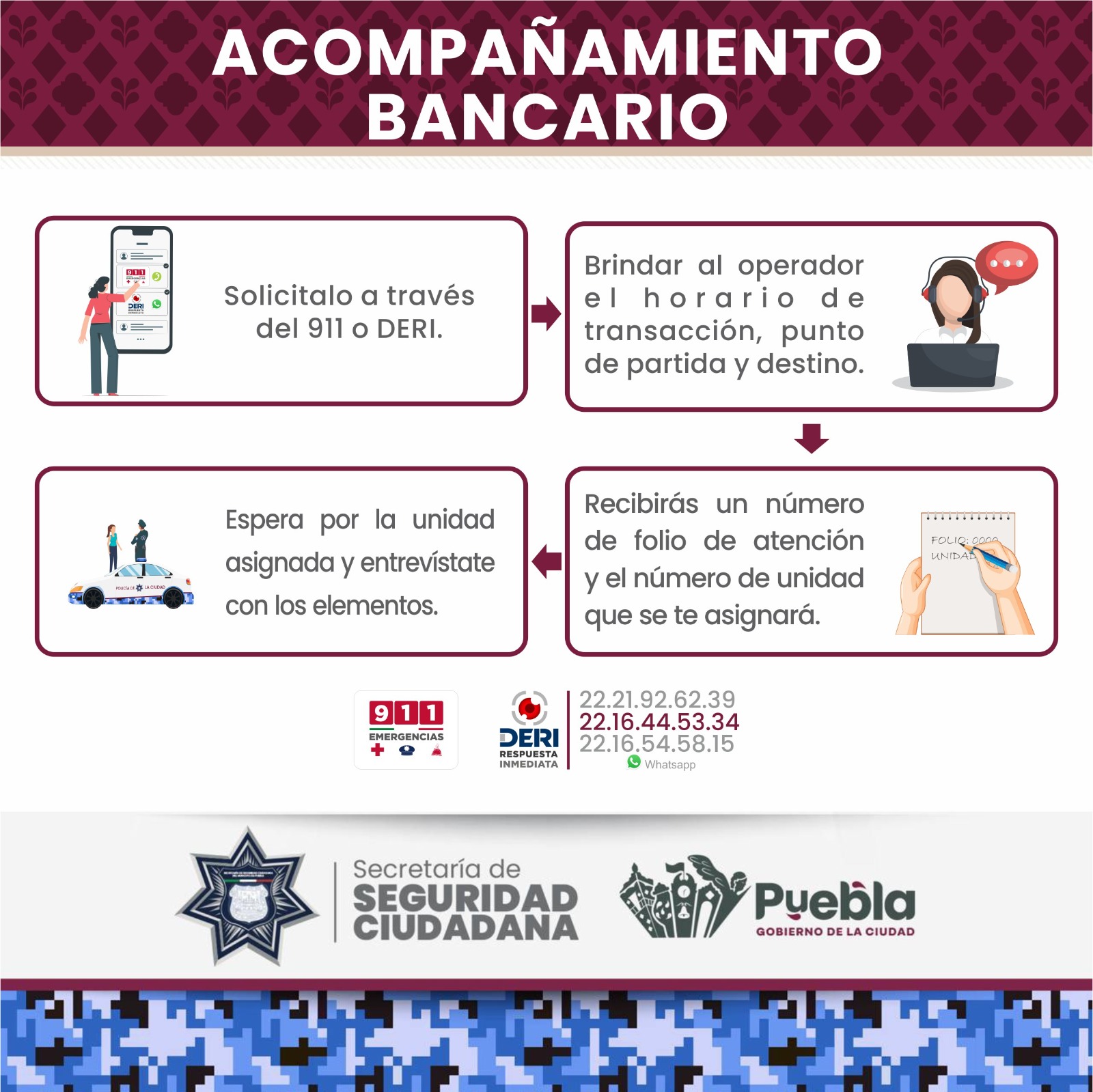 El servicio gratuito de acompañamiento bancario, que ofrece la Secretaría de Seguridad Ciudadana (SSC), continúa en apoyo a toda la ciudadanía que acuda a realizar cualquier transacción al interior de sucursales bancarias o cajeros automáticos.