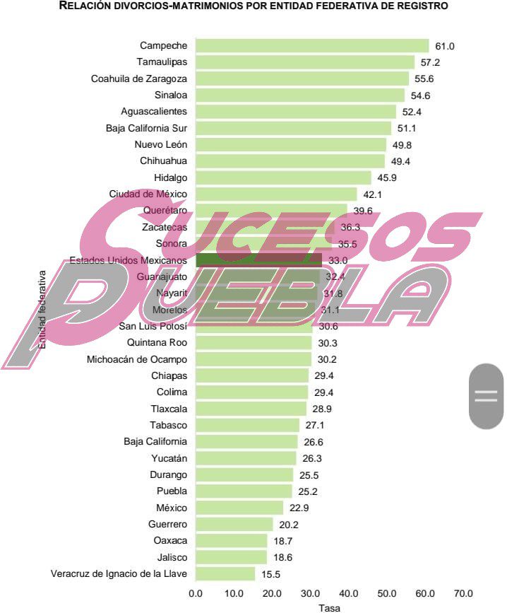 En Puebla hubo 4 mil 072 divorcios, cuya tasa es del 25 por cada cien matrimonios, la sexta más baja del país, aunque en números reales es de las 13 entidades con más separaciones registradas.