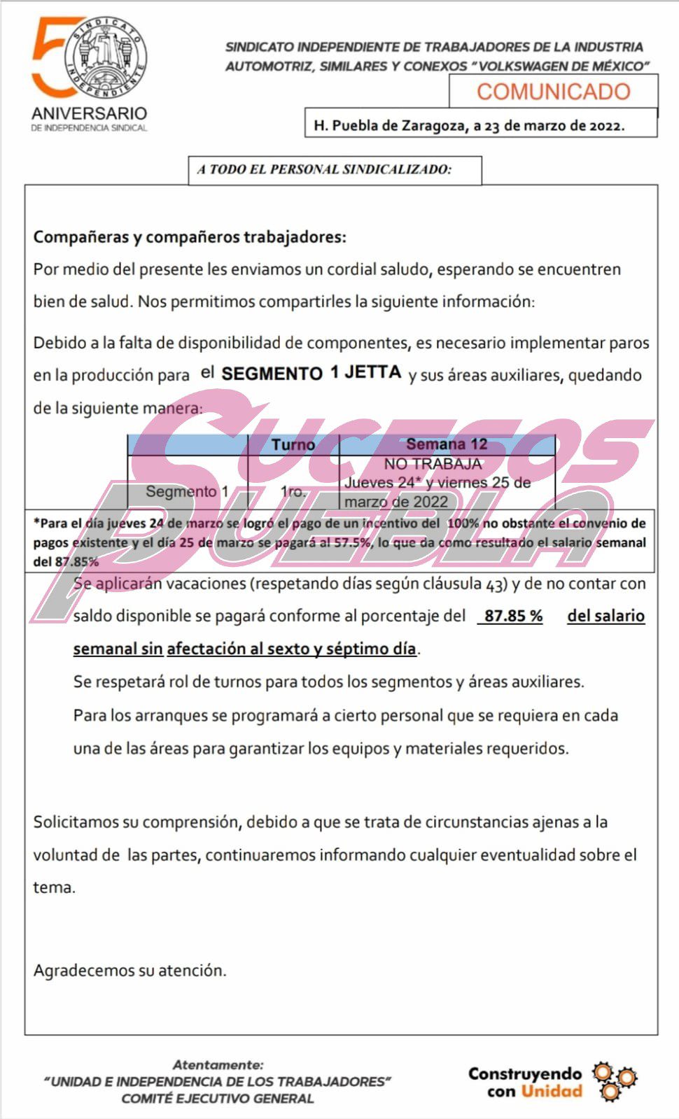 En un comunicado firmado por el Sindicato Independiente de Trabajadores de la Industria Automotriz de Volkswagen Sitiavw se da a conocer la suspensión del primer turno del segmento Jetta para este jueves y viernes.